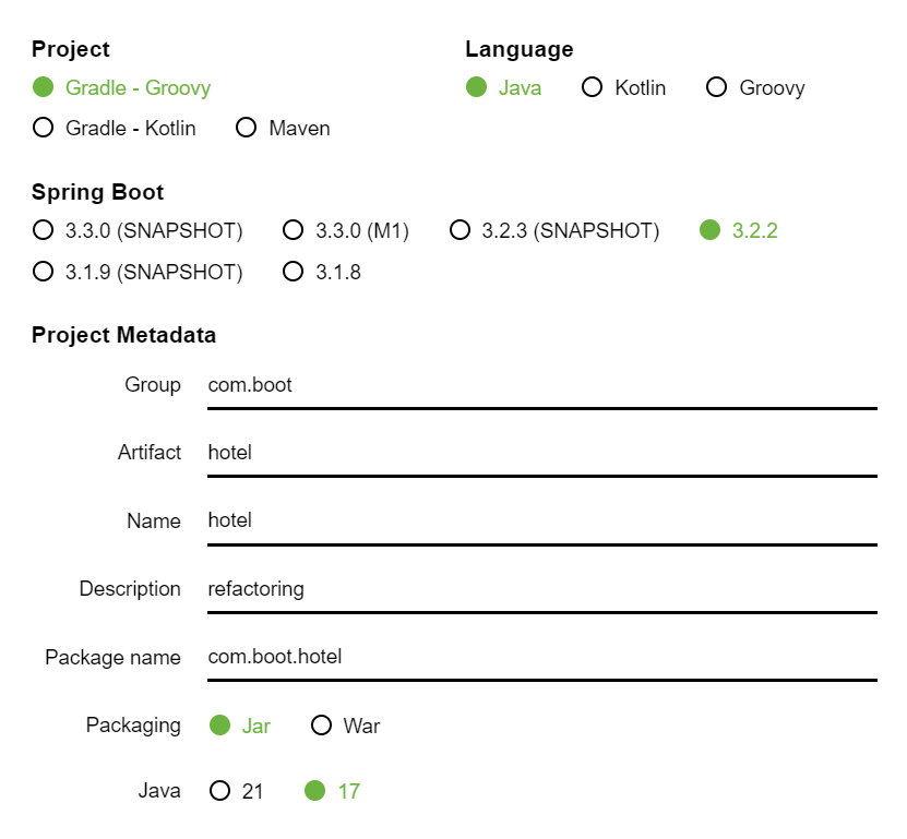 일단, Gradle - Groovy, Language - Java, SpringBoot - 3.2.2, Package - Jar, Java - 17로 세팅해주었다.